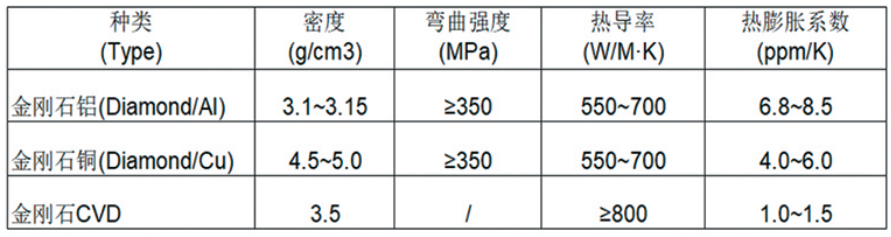金刚石铜、金刚石铝是目前性能最佳的散热材料。(单晶金刚石及CVD金刚石热导率高,但热膨胀系数太小;碳纤维复合材料热膨胀/热导性能具有方向性。)